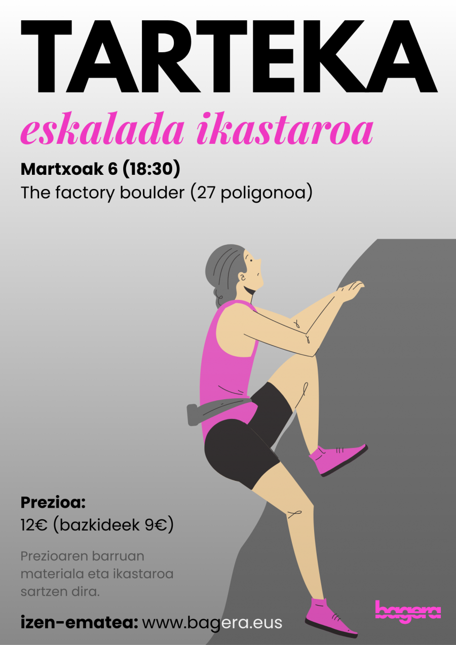 Bagera Elkartetik gogotsu jarraitzen dugu Tarteka egitasmoaren bidez hiriko euskaldunontzako aisialdi-espazioak eta topaguneak sortzen. Oraingoan, kirola eta giro ezin hobea uztartu nahi ditugu; horretarako, eskalada ikastaro bat antolatu dugu martxoaren 6rako. Gainera, albiste pozgarri bat dugu: ahalik eta euskaldun gehienek eskaintza honekin gozatzeko aukera izan dezaten, adin-tartea 35...