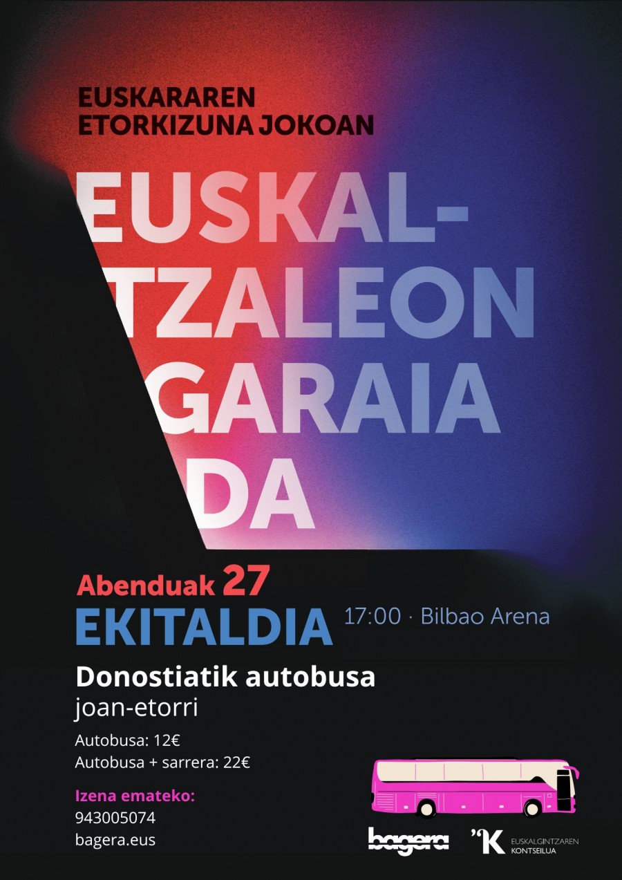 Abenduaren 27ko Miribillako ekitaldirako autobusa antolatu dugu Donostiatik, joan-etorria: Autobusa: 12 € Donostiatik autobusa Plazak mugatuak direnez, gomendioa: egin erreserba lehenbailehen....