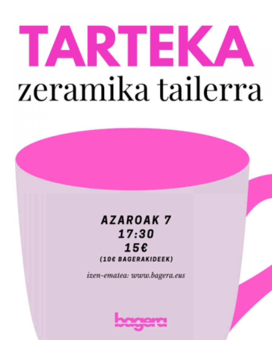Azaroaren 7an, 17:30ean, 90 minutuko zeramika tailerra egingo dugu TARTEKA egitasmoaren barruan. Saio praktikoa izango da, eta parte-hartzaile bakoitzak pieza bat landu eta etxera eramango du. Tailerra Groseko Barro Cerámicaren eskutik jasoko dugu! Zer da TARTEKA? Bageraren egitasmoa da, 18–30 urte bitarteko gazteei zuzendua. Helburua: euskaraz sozializatzeko plan informalak...