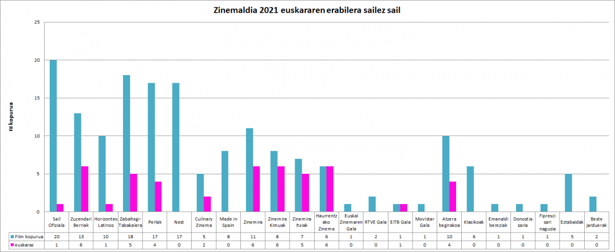 Hona hemen filma guztiak kontutan hartuta 2021eko Zinemaldian izan den euskararen erabilera: